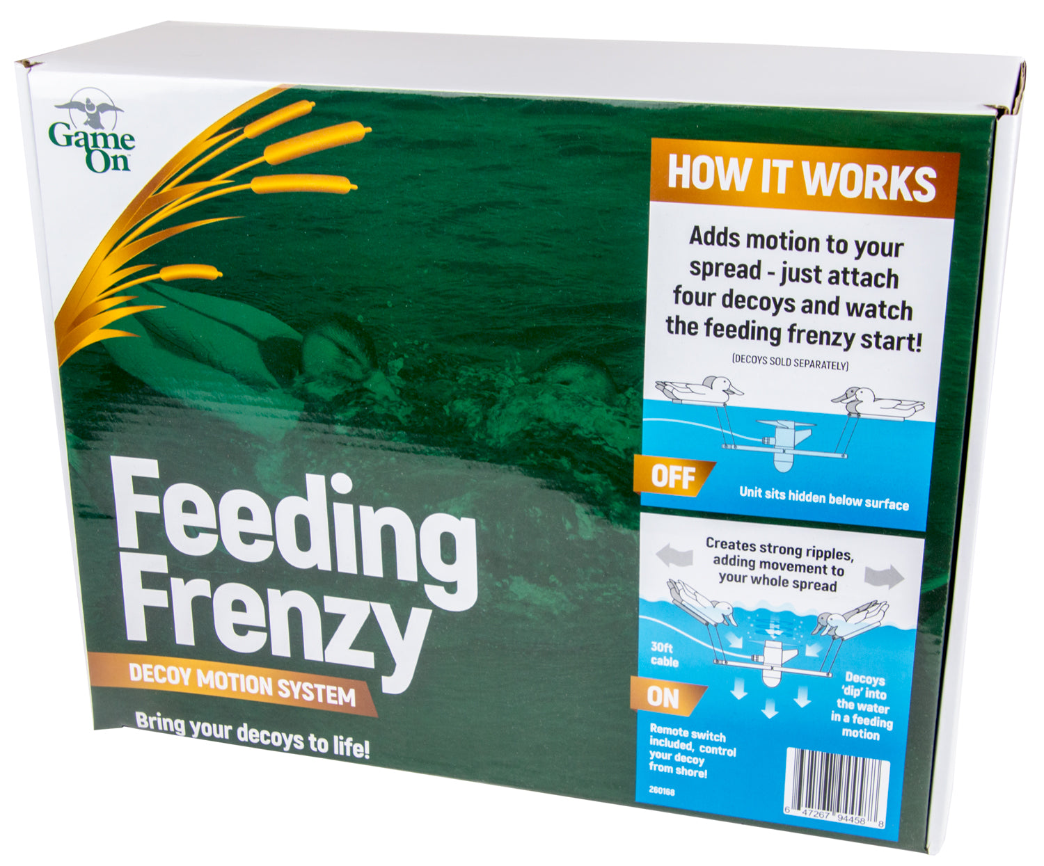 The Feeding Frenzy Motion Decoy System from Game On simulates ducks feeding beneath the surface like a pro! Just attach four decoys (sold separately), drop them in the pond, and let the 30-foot cable and powerful motor do their thing. The 12-volt, 200-watt motor pulls the decoys under, creating ripples that make your whole spread look like it's having a snack break. It’s the perfect way to get those passive decoys to stop just floating and start flying into action.
